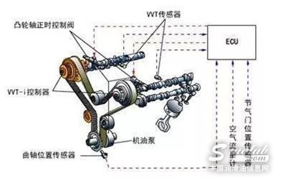 丰田VVT-i技术的工作原理是:当发动机由低速向高速转换时,电子计算机就自动地将机油压向进气凸轮轴驱动齿轮内的小涡轮,这样,在压力的作用下,小涡轮就相对于齿轮壳旋转一定的角度,从而使凸轮轴在固定的范围内向前或向后旋转,从而改变进气门开启的时刻,达到连续调节气门正时的目的。