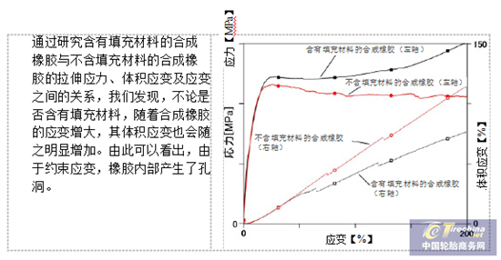 含有填充材料的合成橡胶,其“孔洞”在聚合物之间产生,而这些“孔洞”相互连接在一起导致了橡胶分子的破裂。而随着填充材料补强作用的增强,会抑制“孔洞”继续变大。