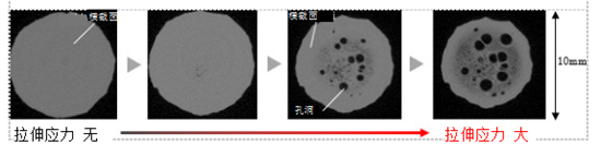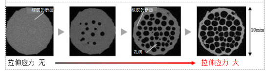 如果合成橡胶试验品在受到垂直于金属板方向上的拉伸力时,根据橡胶自身的特性,橡胶试验品会向垂直于受力的方向收缩。然而,由于试验品是被粘贴固定在金属板上,所以受力时却又无法自行收缩,结果致使橡胶膨胀,进而可以使我们通过CT直接观察到橡胶内部及其“孔洞”形成的过程。