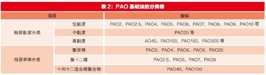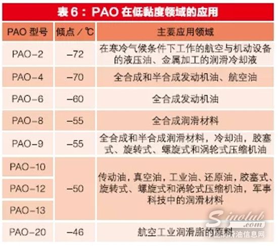 PAO基础油由于其特殊性能,是汽车、机械工业和航天工业用合成润滑油的主要原料(详见表6)。