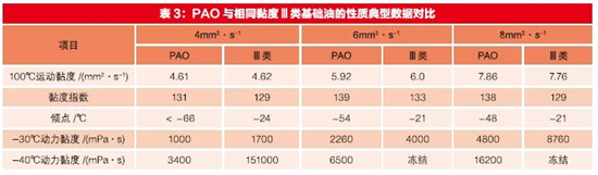 PAO基础油是由一定碳数的α-烯烃在催化体系作用下齐聚再加氢精制饱和的烯烃低聚物,与传统矿物基础油相比,分子结构规整,其具有优异的黏温性能(见黏度指数)和高低温性能(见CCS),分别见表3和表4。