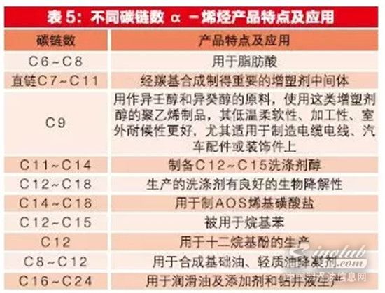 α-烯烃用途广泛,不同单体聚合度不一样,产品特征也不一样(见表5)。