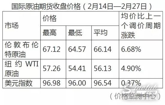 据国家发改委价格监测中心监测,本轮成品油调价周期内(2月14日—2月27日),国际油价震荡上行。伦敦布伦特、纽约WTI油价比上轮调价周期上涨5.79%。受此影响,国内汽油、柴油零售价格随之上调。