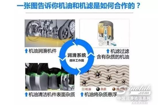 机油在发动机内流动,在润滑机件的同时,还会将附着在机件表面的杂质洗下来。洗下来的杂质在机油清洁因子的作用下悬浮在机油中,随机油流动。在流经机滤时,较大的杂质就会被过滤掉,过滤后的干净机油又会重新进入到润滑系统中循环。文字解释多少有些抽象,下面这张示意图就简单直观多了: