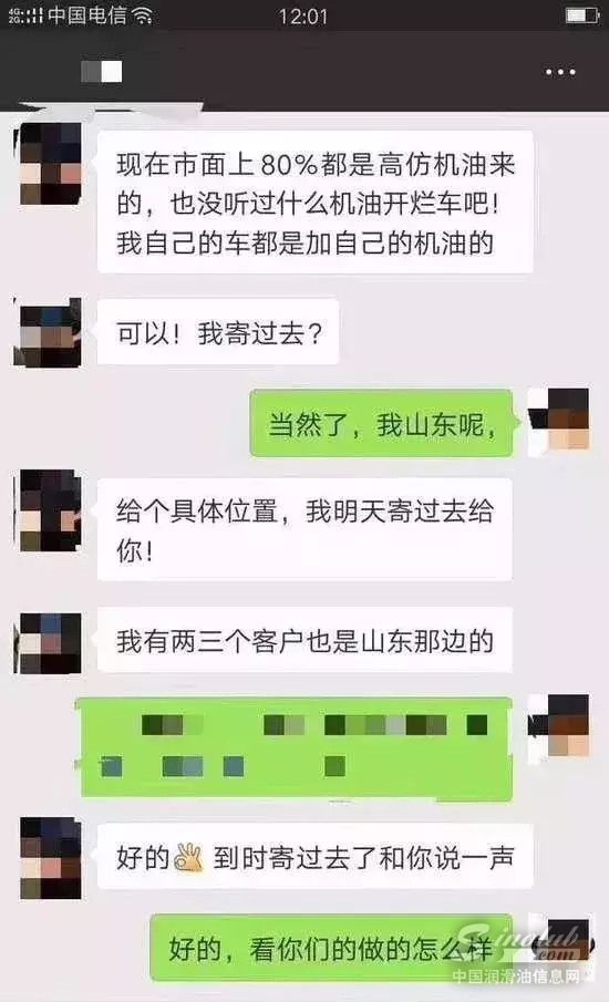 下面双方的聊天记录,网友与自称机油售卖的人员沟通时,通过对方给出的价格,网友一眼看出机油都是高仿产品。不仅如此,机油售卖员想通过低价合作的方式拉拢网友,为打消疑虑,并称市场上80%的机油都是高仿的。