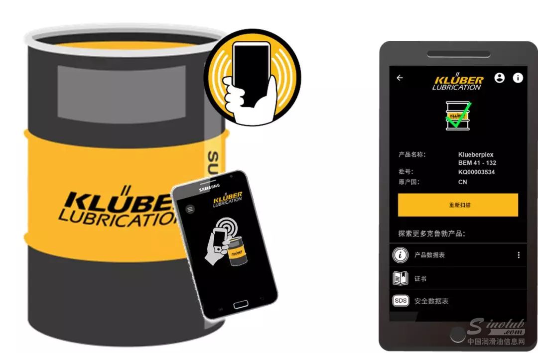 真品是保证质量的前提。目前,在大于500g的克鲁勃润滑剂产品包装上都贴有圆形的NFC标签,打开MyKlueber软件,点击“扫描NFC标签”,将手机贴近产品表面的标签即可开始验证过程。只要轻轻一点,先进的近场通信(NFC)技术便可迅速捕获产品信息和安全数据表,安全方便,让假货无处可遁。