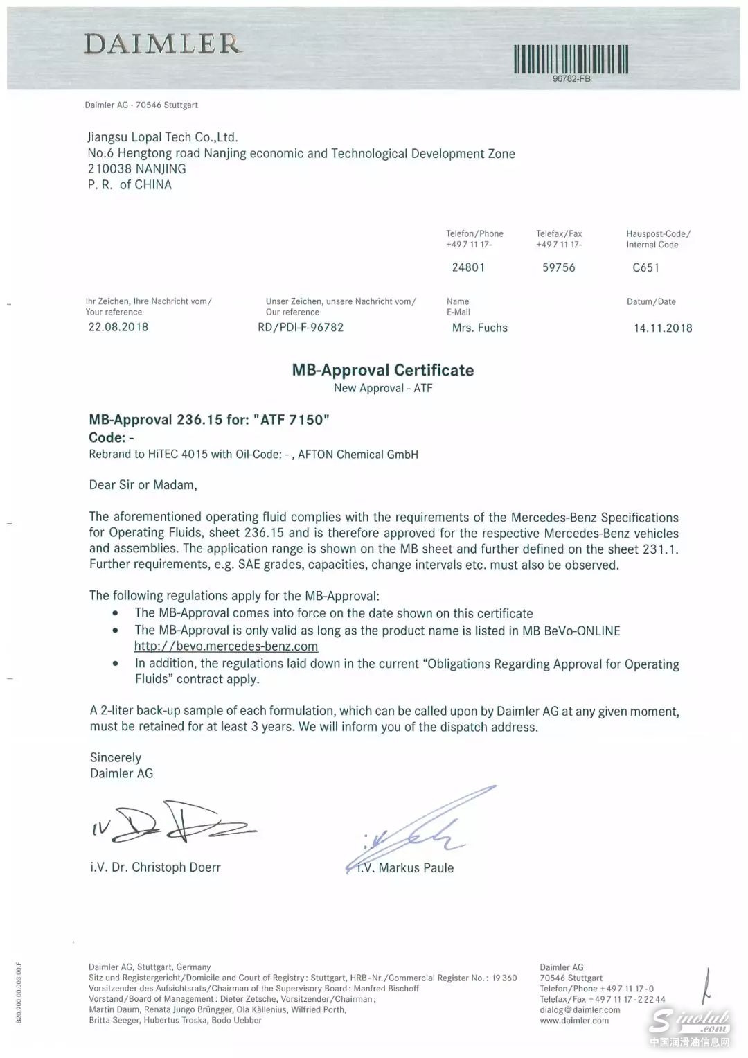 龙蟠ATF7150荣获“奔驰236.15”认证