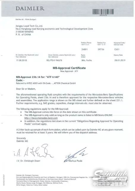 龙蟠自动变速箱油获得“奔驰236.14”认证
