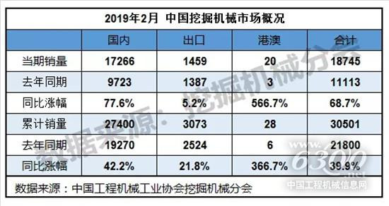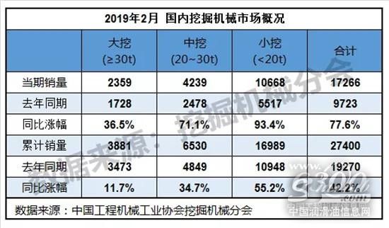 19年工程机械行业持续红火,2月国内销量同比涨幅77.6%!据中国工程机械工业协会挖掘机械分会行业统计数据,2019年1月,纳入统计的25家主机制造企业共计销售各类挖掘机械产品11756台,同比涨幅10.0%;国内市场销量(统计范畴不含港澳台)10134台,同比涨幅6.1%。19年2月,共计销售18745台,同比涨幅68.7%;国内市场销量17266台,同比涨幅77.6%。