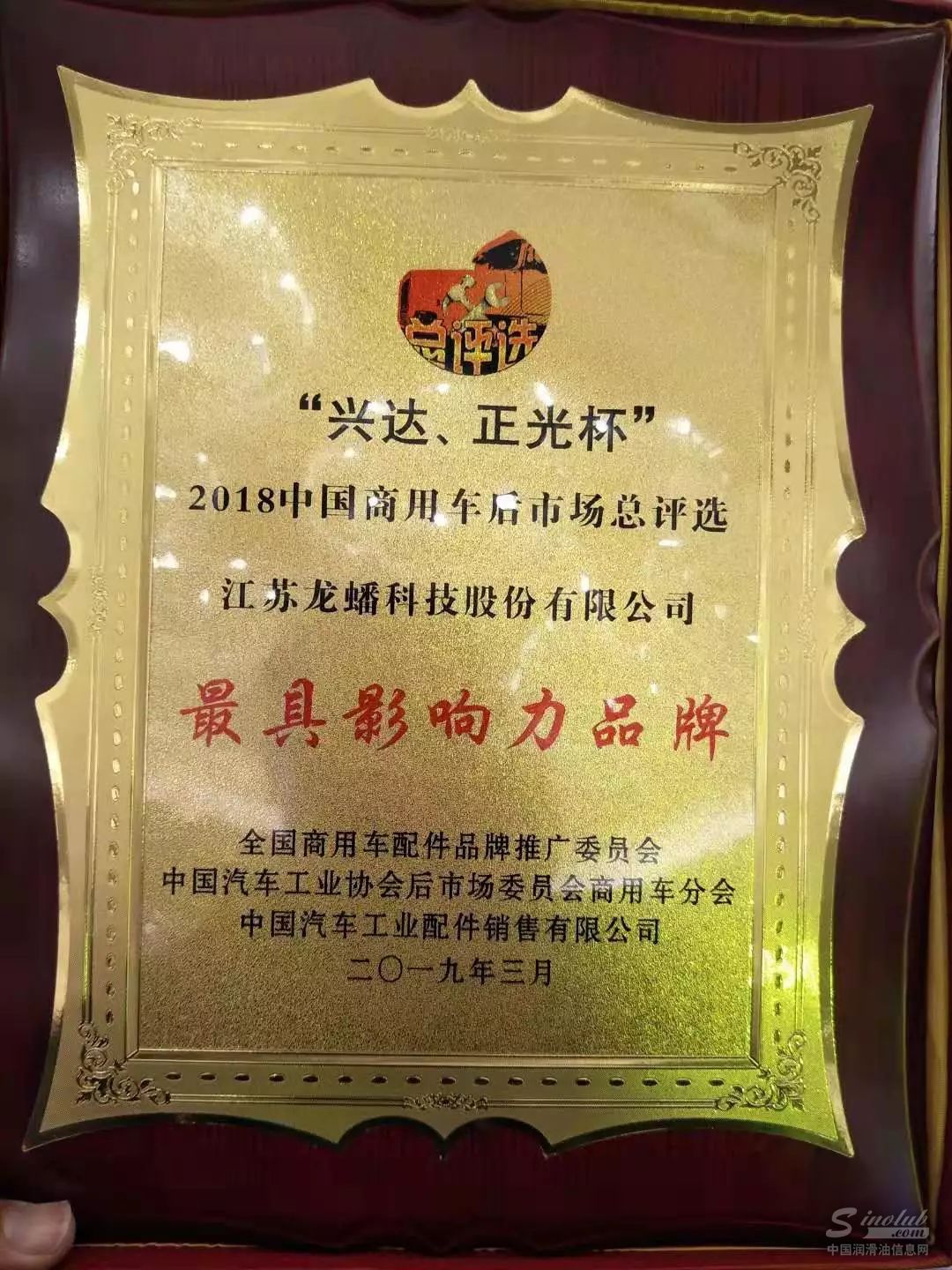 2019年3月17日, 由中国汽车工业协会后市场委员会指导的“中国商用车后市场年度大会”在杭州隆重召开。凭借在绿色环保化学领域的专业成就和领先业绩,龙蟠科技被授予2018中国商用车后市场总评选“最具影响力品牌”称号。除此之外,龙蟠科技旗下专注国五国六系统解决方案的子品牌——江苏可兰素汽车环保科技有限公司,也特别荣获“蓝天卫士尿素品牌”称号。