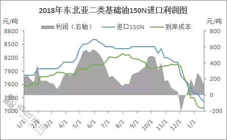 从进口利润图中可以看出,2月中旬至4月上旬,进口基础油利润长期处于低位,多数进口商长期面临成本出货的局面。4月中旬至6月中旬,到岸150N价格不断上涨,同时人民币汇率窄幅波动,国内进口商进口利润可观。6月份之后,人民币汇率的大幅波动推动基础油到岸成本持续飙升,进口商利润空间受到明显压制。12月中下旬,在进口产品价格持续下跌及人民币汇率支撑下,150N到按成本下滑,成本倒挂局面有所缓解。