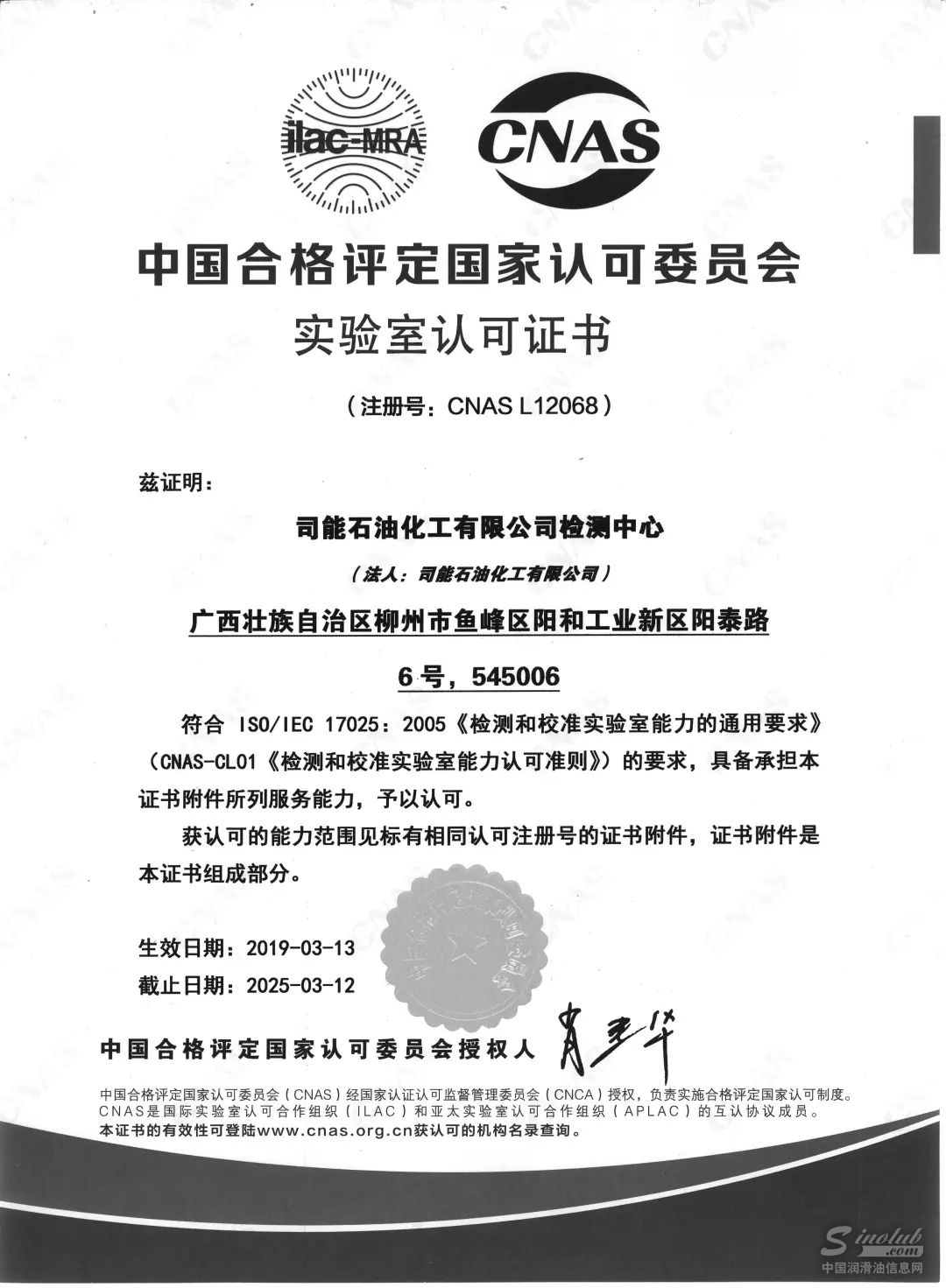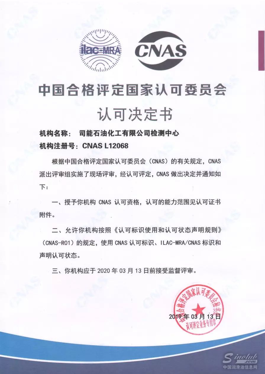2019年3月,司能石油化工有限公司检测中心正式通过中国合格评定国家认可委员会审批(证书编号: CNAS L12068),成为按照国际标准ISO/IEC 17025体系运行并通过CNAS认可的国家级检测实验室。这标志着司能石化实验室检测服务获得政府的权威认可,也再次证明了司能在润滑油行业技术研发和品质管理上的强大竞争力。