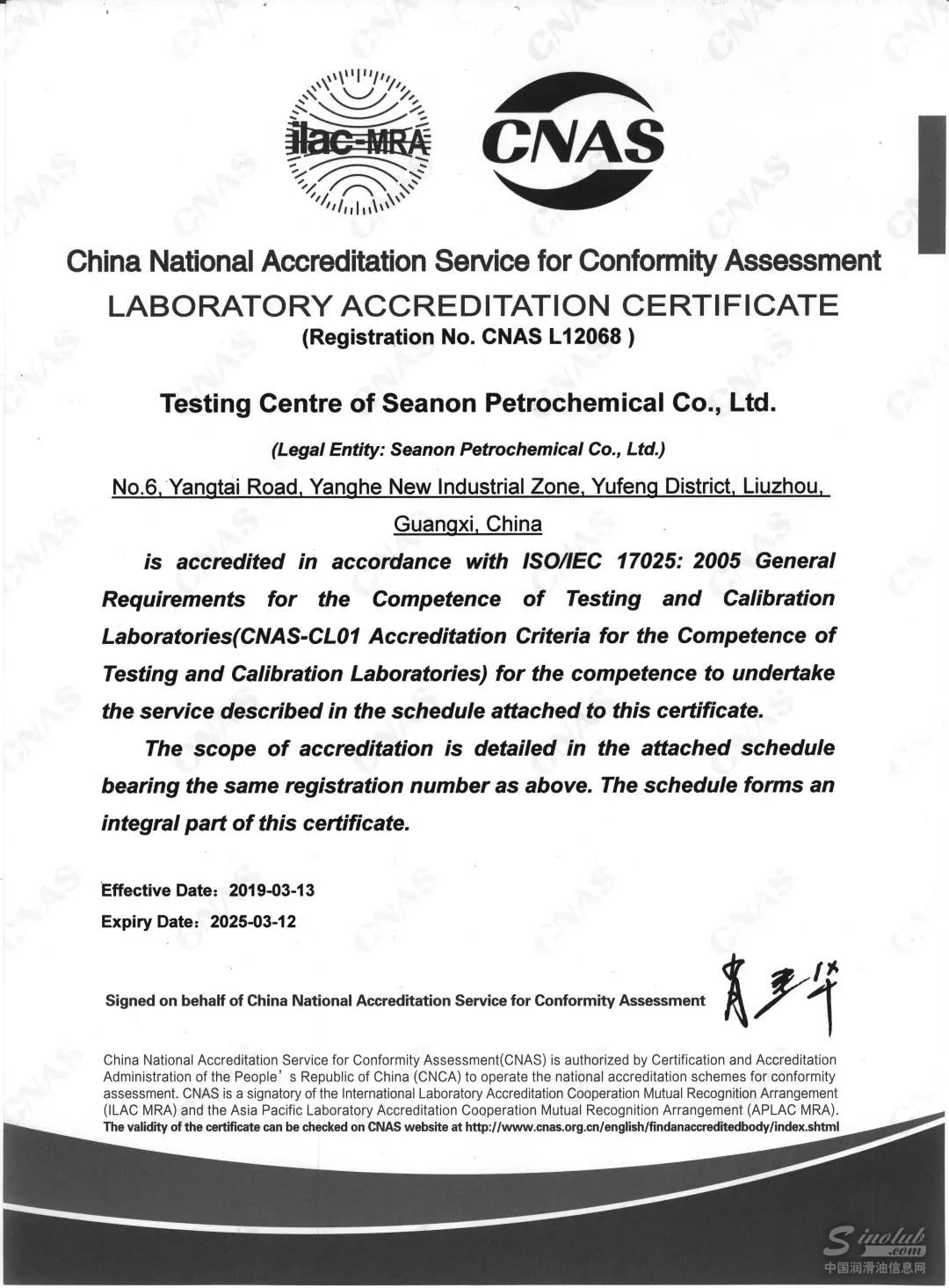 中国合格评定国家认可委员会CNAS是我国目前唯一权威的实验室认可机构。就目前中国行业内而言,仅中石油、中石化、埃克森美孚、顺昌润滑油下辖共22家检测中心获得此认可。通过CNAS认可,表明司能石化检测中心具备按ISO/IEC 17025认可准则开展检测服务的技术能力和管理能力,检测中心对外出具CNAS标识的检测报告,被全球60多个国家和地区所认可,具有国际公信力和权威性。