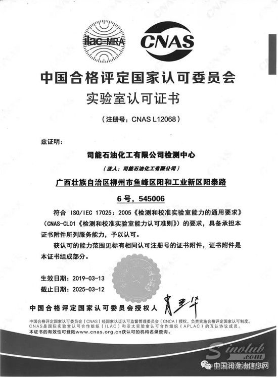 3月,司能公司检测中心通过中国合格评定国家认可委员会(CNAS)审批。CNAS是我国目前唯一权威的实验室认可机构,对外出具的CNAS标识检测报告将获得全球60多个国家和地区认可,在华经营的润滑油企业仅有22家通过该审批。