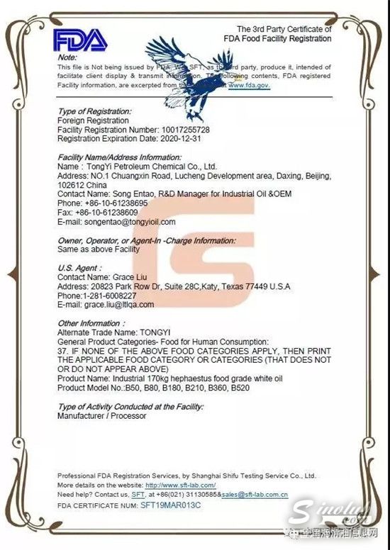 近日,统一“荷士塔”食品级白油获美国美国食品药物管理局(FDA)国际认证。FDA是世界著名的食品与药物管理政府机构,以其极度严苛的认证与规范著称,在全球生技医药学术界具有巨大影响力。