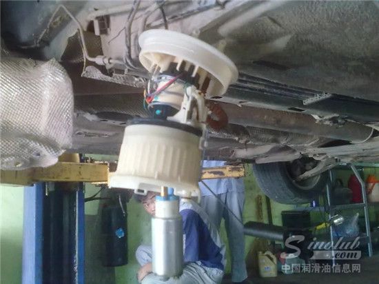 (下图是卸掉汽油箱,拆掉燃油泵总成,连接到供电端子插头检测场景,启动马达时候无电源输入,悬挂在底部的是油泵芯)