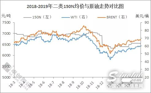 2019年一季度国内基础油市场整体表现一般,与去年相比,终端需求启动缓慢,市场交投持续疲软;新装置陆续投产,资源供应进一步增加,资源消化成为一季度国内基础油市场的主旋律。据卓创资讯数据统计,截至3月底,国内二类150N均价在6505元/吨,较年初小幅上涨2.97%;与去年同期相比,下跌6.4%,跌幅较大。一季度二类150N均价为6770.96元/吨,较2018年四季度下跌4.56%。
