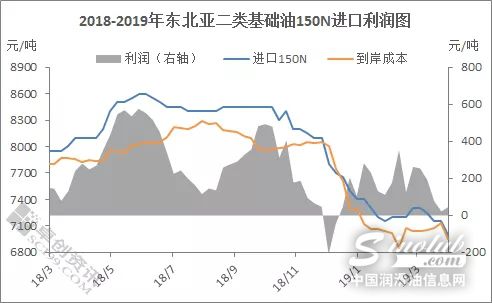 在进口利润较低的情况下,贸易商进口热情有所下降。据卓创统计,2019年1-2月份,基础油进口总量为49.28万吨,与去年同期相比,累计下跌2.72%。