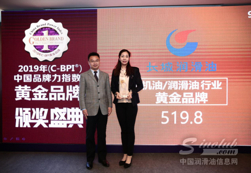 2019年4月15日,中国领先的品牌评级与品牌顾问机构Chnbrand发布了2019年(第九届)中国品牌力指数SM(C-BPI®)品牌排名和分析报告,其中长城润滑油凭借技术引领能力与创新能力,不断推出先进润滑技术解决方案与完善的配套服务体系,深耕海内外市场,赢得了消费者的信赖与支持。在C-BPI年度评选中获得519.8分高分,荣膺润滑油/机油领域第一名,实现了在C-BPI评比中的行业“九连冠”,体现了强大的品牌活力与影响力。