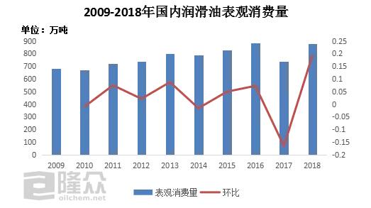 随着我国绿色经济的不断推进,节能、环保、高效已经成为各行业在发展过程中必须面对的新要求,润滑油行业亦无法避免。在消费量方面,隆众资讯数据显示,2018年我国润滑油表观消费量约在880万吨,环比上升19%,从2013年中国润滑油表观消费量开始出现下降,按照我国润滑油淘汰率60%测算,每年我国将产生约490万吨废润滑油,相当于近200家中小企业年产量的总和。