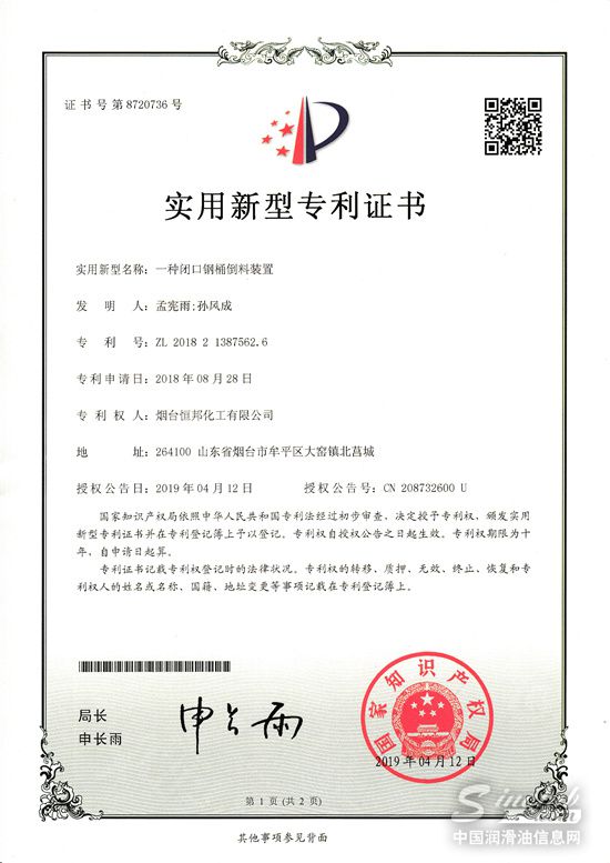 近日,烟台恒邦化工有限公司“一种闭口钢桶倒料装置”实用新型专利获得国家知识产权局授权。