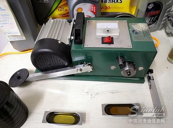 其中一位名叫张明(音)的男子在介绍产品特性的同时,为记者演示了“华汽动力”润滑油的抗磨实验。只见其在一台润滑油抗磨试验机油槽内倒入一款某国际品牌润滑油,电机转动使油槽内的滚轮与光滑的钢柱相摩擦,在机器另一端不断压上砝码,在加到第3块砝码时,滚轮和钢柱受压到极限不再转动,光滑的钢柱体上磨痕明显。