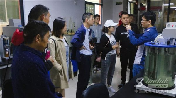 优秀经销商代表到达鲁克(中国)润滑油有限公司厂区,在陈文渊厂长及技术部陈志东总监带领客户参观了鲁克公司润滑油产品展厅、荣誉室、生产车间、成品油储存区、调和车间、基础油储备区、实验室,在实验室陈总监让大家逐一认识了先进的实验检测设备。