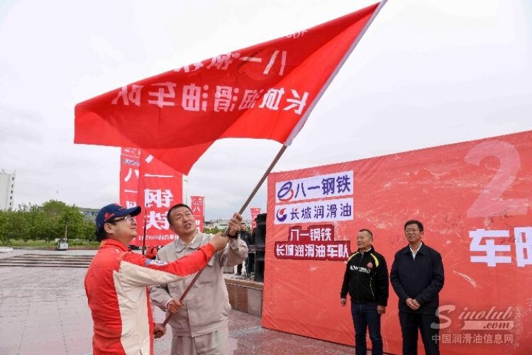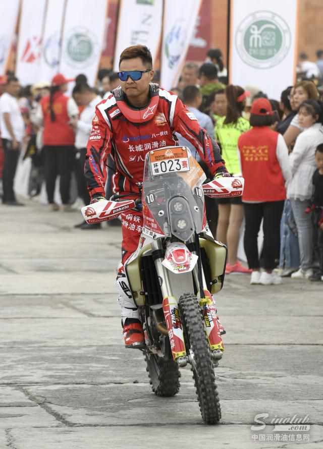 (图:八一钢铁长城润滑油车队车手王雲骑车亮相发车仪式)