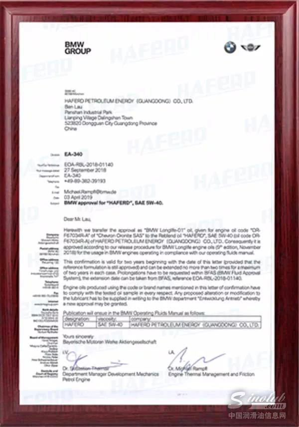哈弗润滑油汽机油系列产品获得德国宝马技术认证
