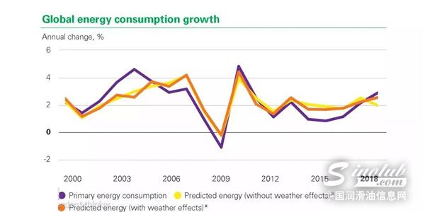 根据BP的《世界能源统计年鉴2019》,2018年全球一次能源消费以2.9%的速度增长。几乎是10年均值(1.5%)的两倍,也是自2010年以来最快的增速。