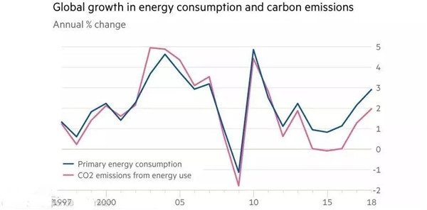 然而,讽刺的是,在社会日益关注气候变化并采取必要的行动计划之际,能源需求和排放正以多年来最快的速度在增长。根据BP的《世界能源统计年鉴2019》数据显示,在能源消费快速增长的同时,碳排放也在快速增长。2018年碳排放增长2%,为7年来最快增速。BP首席经济学家斯宾塞•戴尔(Spencer Dale)表示,这一排放增幅相当于在全球道路上多开4亿辆内燃机车。