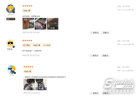 随便进入一家苏宁易购机油自营旗舰店,店铺里众多好评大多显示都不是第一次购买,看来老司机们消费机油的习惯是,一旦认定了某个渠道的产品,就会固定在这个渠道购买,这的确是一个明智的选择。