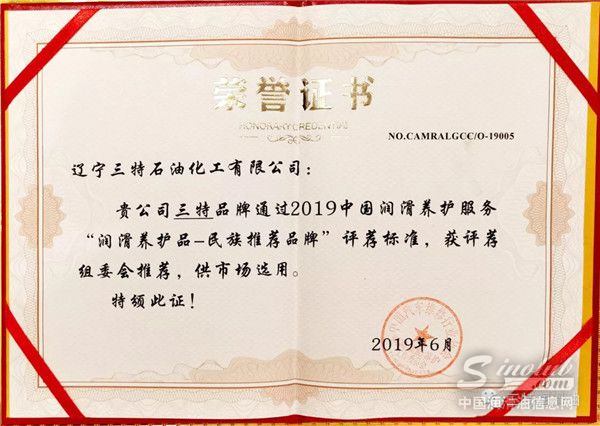 三特润滑油获称“润滑养护-民族推荐品牌”