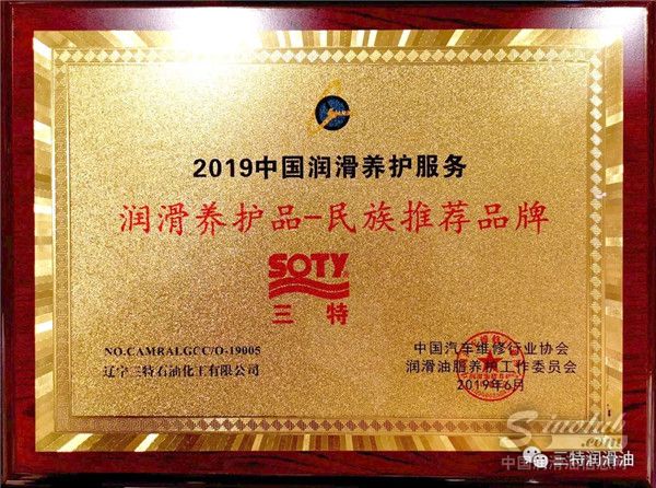 在南京峰会同期举行的“2019中国润滑养护服务‘推荐品牌’授牌仪式”,三特润滑油作为此次中国润滑油养护“润滑养护品-民族推荐品牌”荣誉获得者,出席了此次会议。