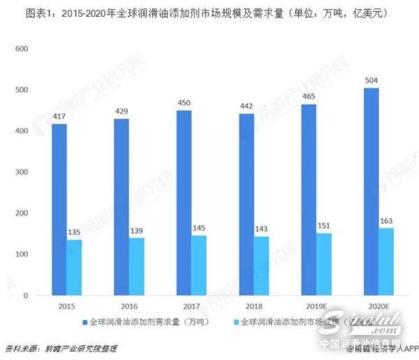 添加剂是润滑油产业链中重要的组成部分,加入到润滑油中,可以赋予润滑油各种功能特性。在全球市场中,润滑油添加剂全球市场消费量保持稳定,亚太地区消耗量的预期增速快于其他地区。在此期间欧洲、北美添加剂市场出现下降,主要由于2008年至2010年全球经济衰退和2011年欧洲主权债务危机导致,不过中国、印度为代表的亚太新兴国家在该期间的消费量快速增长保证了全球供需的稳定。2018年,全球润滑油添加剂市场消费量约为442万吨,市场规模达到143亿美元。