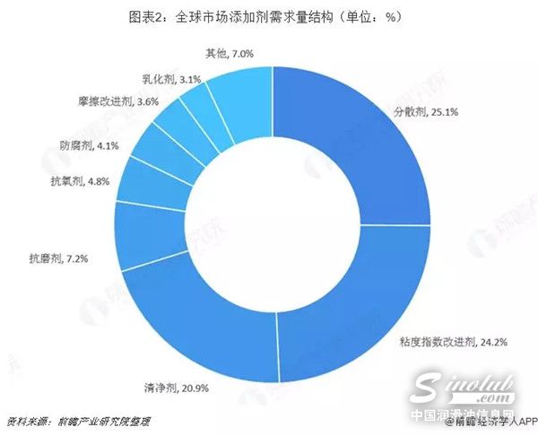 由于目前全球润滑油行业需求大部分为车用润滑油,而车用润滑油的发动机油需要种类更多,质量更高的润滑油,需要在基础油中添加清净剂、分散剂和粘度指数改进剂来提高润滑油的各项指标,因此,分散剂、粘度指数改进剂和清净剂需求最大。在各类润滑油添加剂中,分散剂、粘度指数改进剂、清净剂3大功能剂占添加剂总消耗量的71%,其中分散剂占比最大,约占全球添加剂需求量的25.1%;其次为粘度指数改进剂,约占全球添加剂需求量的24.2%;清净剂约占全球添加剂需求量的20.9%。