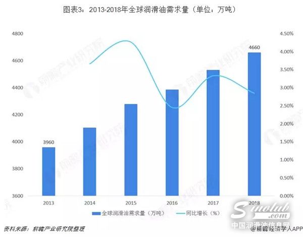 随着全球汽车工业不断发展,汽车保有量不断上升,对润滑油的需求也持续增大,全球润滑油供给和需求量虽有所震荡,但是基本保持稳定增长。根据中国润滑油网数据显示,2013-2018年,全球润滑油消耗量由3960万吨增长至4660万吨,年均增长率到达3.53%。
