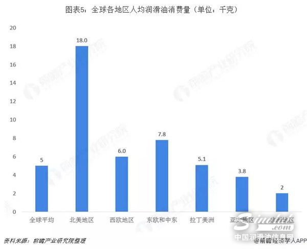世界年人均润滑油消耗约5千克,但地区差异非常显著。北美人均消费量超过18千克。而亚太地区人均消费不足4千克,非洲仅仅2千克。西欧人均消耗约9千克,东欧和中东人均消耗接近8千克,拉丁美洲人均消费量也刚刚超过5千克。作为全球经济增长的引擎,亚太地区润滑油行业将持续保持快速增长状态,亚太地区人均消耗量较发达地区差距较大,市场增长空间十分乐观。