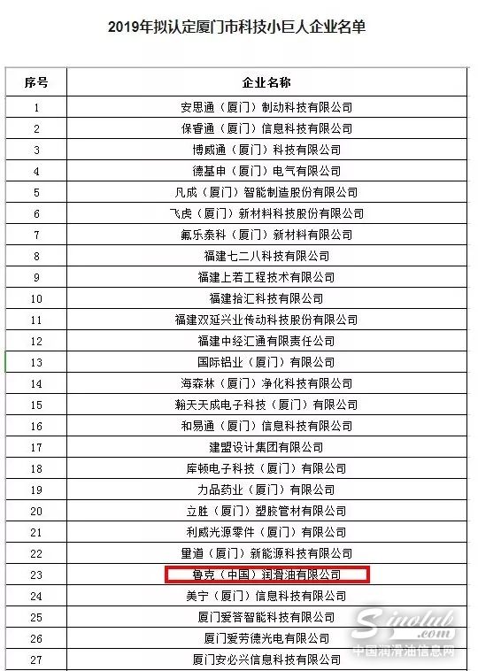 近日,厦门市科学技术局公布了厦门市2019年科技小巨人企业及领军企业名单,鲁克(中国)润滑油有限公司(下简称:鲁克中国)作为极具潜力的新兴企业代表荣获“厦门市科技小巨人企业”称号。