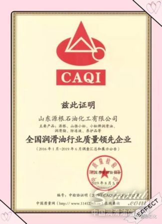 源根石化连续四年荣获“全国润滑油行业质量领先企业”荣誉