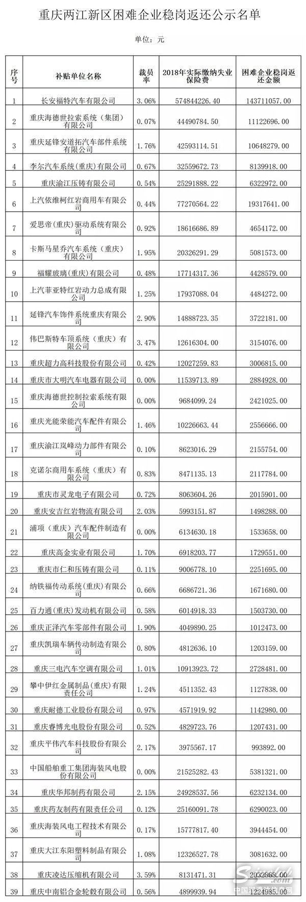 名单中大部分为汽车企业及汽车零部件配套企业,且目前裁员率较低。重庆两江新区表示,按照《重庆市人力资源和社会保障局等5个部门关于做好失业保险支持困难企业稳定岗位工作有关问题的通知》和《重庆市人力资源和社会保障局办公室关于做好失业保险支持困难企业稳定岗位有关经办工作的通知》要求,经审核,拟确定上汽依维柯红岩商用车有限公司等39家企业为第1批享受困难企业稳岗返还单位。