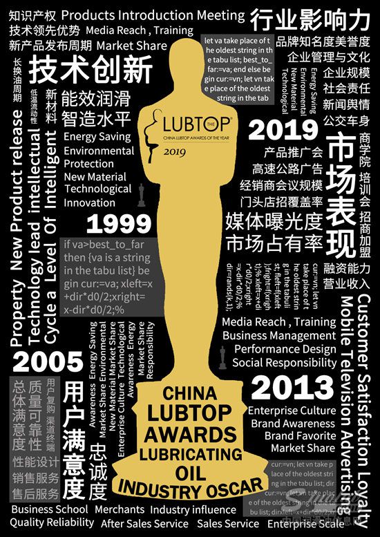 近日,“润滑油行业奥斯卡”LubTop2019总评榜申报工作正如火如荼进行中。由美孚、壳牌、嘉实多等一线国际品牌领衔,中国主流自主品牌实力的 “行业奥斯卡”再度吸引了润滑油全产业链的关注。众所周知,这些奖项对加深渠道和消费者对润滑油企业品牌的认识起了极大的作用,成为获奖企业向渠道和消费者分享产品卓越品质和品牌荣耀的助推器,推动了企业的高质量发展。