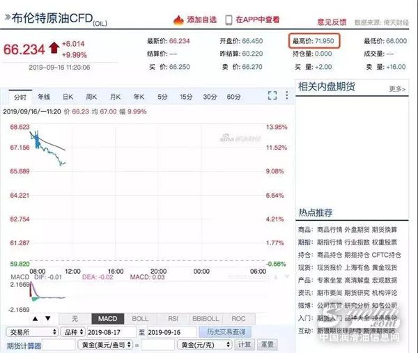 受沙特阿美遇袭事件影响,布伦特和纽约油价昨日双双飙升。布伦特原油开盘后大涨19%,创下1991年以来最大日内涨幅。截至北京时间16日上午10点30分,10月交割的西得州中质原油期货价格涨至每桶60.18美元,涨幅为9.72%;11月交割的布伦特原油期货价格涨至每桶66.76美元,涨幅为10.86%。