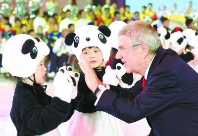 (图:北京冬奥会吉祥物发布仪式上,国际奥委会主席巴赫与北京小学生击掌)