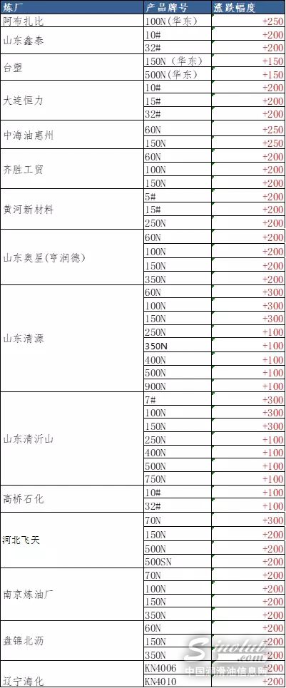 由于爆炸事故发生时正值国内中秋节小长假,而且基础油受原油市场影响有一定延后性,因此本日市场涨幅基本集中在100-300元/吨范围内,基本为试探性上调,目前除山东清源集团外,其他炼厂暂未二次拉涨。