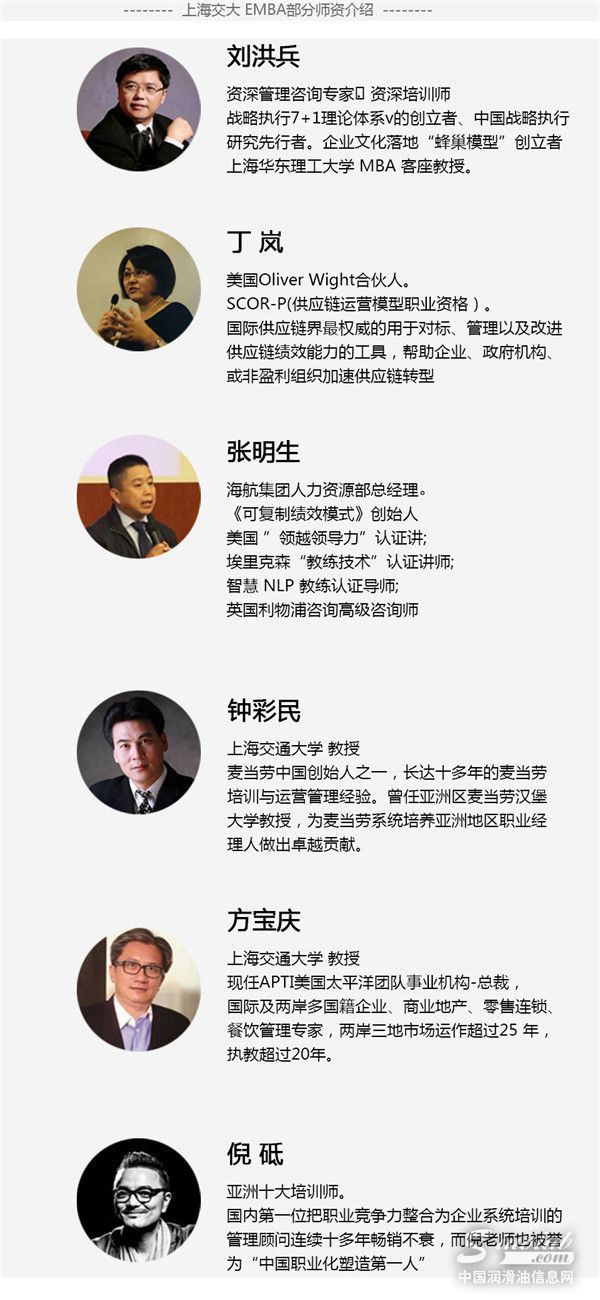 润滑油行业是中国汽车后市场重要的组成部分,行业发展快速,对人才特别是高层管理人才的能力要求急速提升。我们定制了专业的课程,汇聚上海交大、润滑油及汽车后市场行业的名师,搭建行业顶级人脉圈子,帮助中国润滑油行业从业者快速发展。