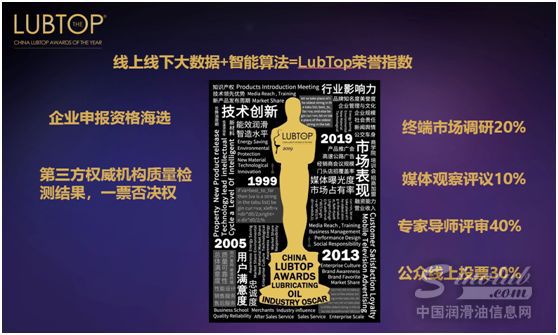 “LubTop2019总评榜”评选活动以技术创新、市场表现、用户满意度、行业影响力等四大维度为品牌评价体系,通过资格海选、公众投票、市场调研、媒体评议、专家评审等环节,以线上线下渠道的大数据和权重系数获取品牌目标函数值,以智能算法得出LubTop品牌荣誉指数,生成“LubTop2019中国润滑油行业年度总评榜”荣誉榜单。作为润滑油和汽车后市场行业极具规模和影响力的全国性评选活动,LubTop年度总评榜是业界公认的由国际巨头领衔、中国领军自主品牌共同参与并实现跨界融合的润滑油和汽车后市场行业“行业奥斯卡”,是品牌品质和行业地位的权威背书。