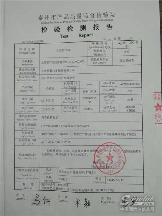 2019年8月份,上海市市场监督管理局开展了2019年度上海市内汽车发动机冷却液产品的质量抽查工作,帝航润滑油的产品很荣幸的被检查小组抽中,在此次随机抽查检测中,此次检查结果显示,抽检合格。