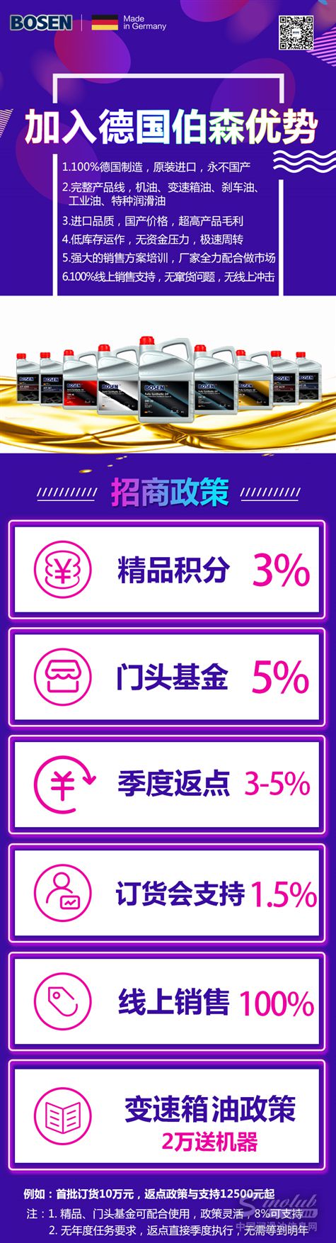 针对变速箱油销售属性与发动机油不一样的情况,特地对变速箱油制定单独的商务政策。变速箱油订单满2万元支持一台全自动变速箱油循环机。据小编了解这样的支持简直是巨大,一般厂家做不到的。估计是德国伯森品牌方在打市场阶段亏本补贴经销商占领市场。