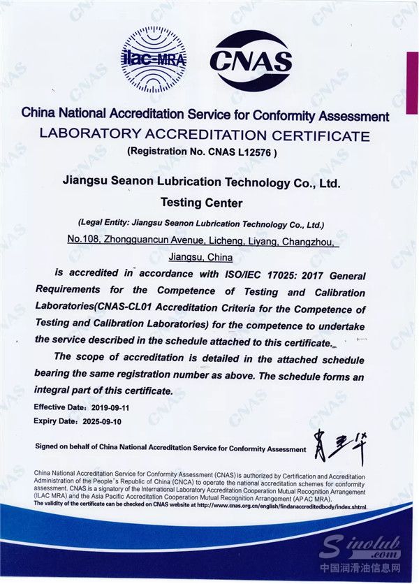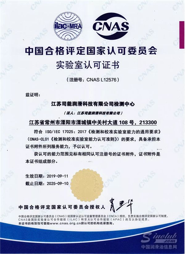 中国合格评定国家认可委员会CNAS是我国目前唯一权威的实验室认可机构。目前在行业内获得此项认可的还有埃克森美孚、中石油润滑油、中石化润滑油、中海油壳牌等下辖的实验室。司能公司通过CNAS认可,意味着公司检测中心具备按ISO/IEC 17025认可准则开展检测服务的技术能力和管理能力,同时证明了公司在润滑油行业技术研发和品质管理上的强大竞争力,今后检测中心对外出具CNAS标识的检测报告,将被全球60多个国家和地区所认可,具有国际公信力和权威性。